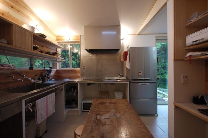 ステンレスでハードな雰囲気の天板のキッチンではありますが、ステンレスの天板に壁の羽目板や森がうつり込むのであまりハードに見えないステンレス天板キッチンです。