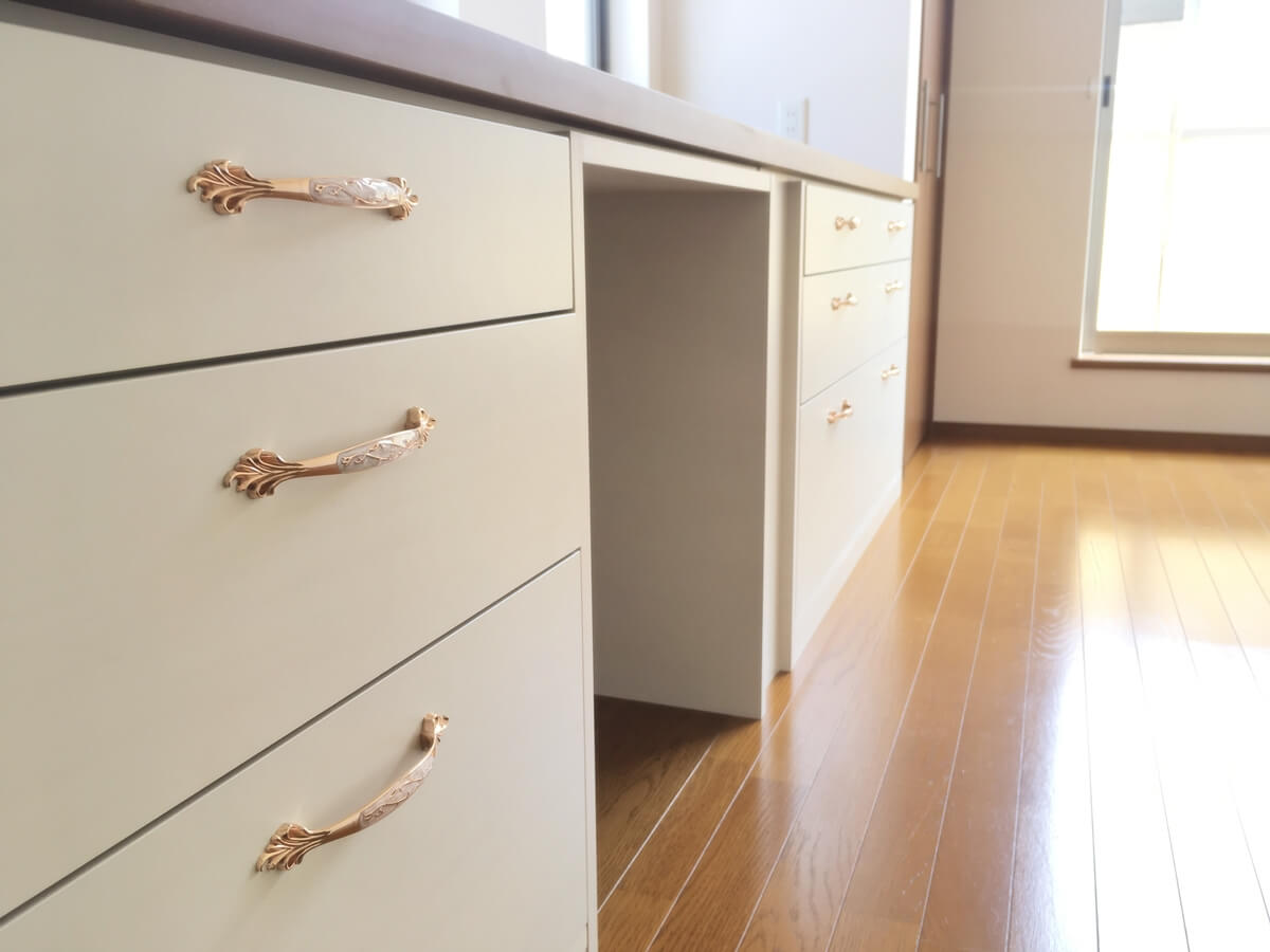 収納自体はシンプルなデザインですが、クラシックな取手を使い、好みのインテリア小物などと合わせやすいものにしています。