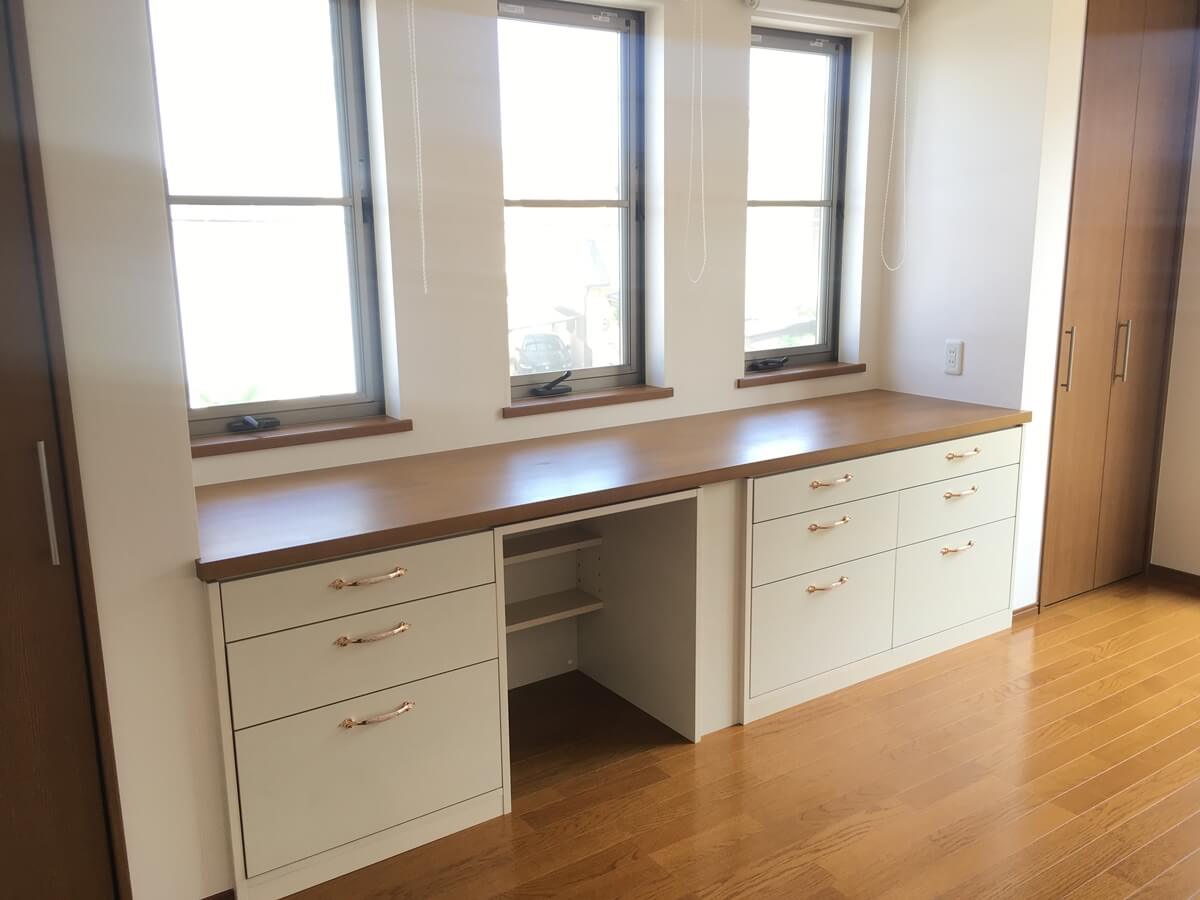 子ども室の1室にはシンプルなデザインのデスク兼収納を設けました。もともとカウンター下部収納があったのですが、扉タイプで収納しにくかったため、カウンターを活かして下部収納を作り替えました。