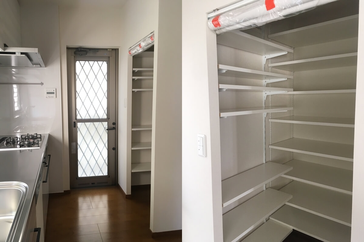 食品ストックやお鍋類などをたくさん収納することが可能です。ダイニング側からは見えにくいのも特徴。