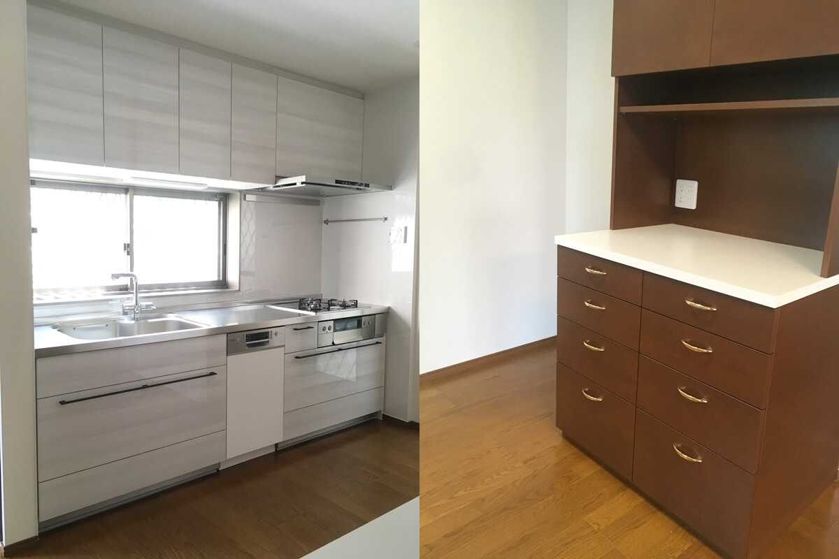 キッチンの背面にはオーブンレンジや炊飯器、食器類も収納できる造作家具を、キッチンの壁を挟んだ隣にはダイニング収納を兼ねた作業台を設けました。