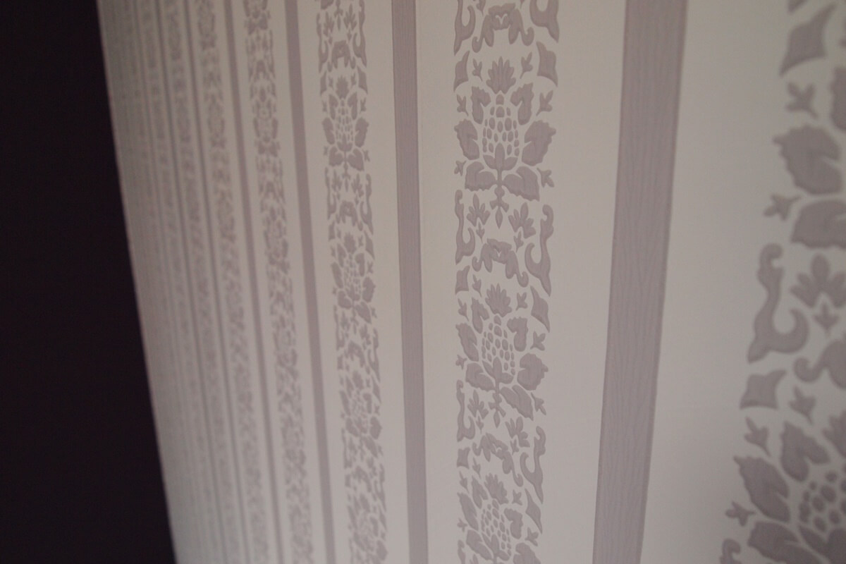 ファローアンドボールのPELTという濃い紫色の塗料をクロスの上にペイントしています。セルフペイントワークショップとしていろんな方に協力して頂きました。ファローアンドボールの壁紙を1面に貼ったので、濃い紫の色がやさしい雰囲気に変わります。