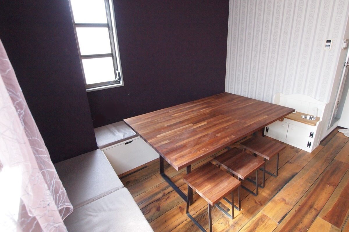 収納力のあるベンチとスツールは40センチの座面、テーブルは65センチという低めのデザインにしています。